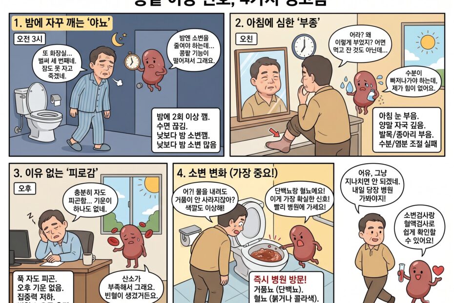1. 왜 콩팥 질환은 조용히 시작될까? 콩팥은 노폐물을 걸러내고, 수분과 전해질 균형을 유지하는 중요한 장기입니다.하지만 초기에는 뚜렷한 증상이 거의 없습니다. 그래서 많은 환자들이 단순한 피로나… 더 보기 »야뇨·부종·피로… 콩팥이 보내는 조기 경고 신호 4가지 (언제 병원에 가야 하는지 명확하게 알려드립니다)