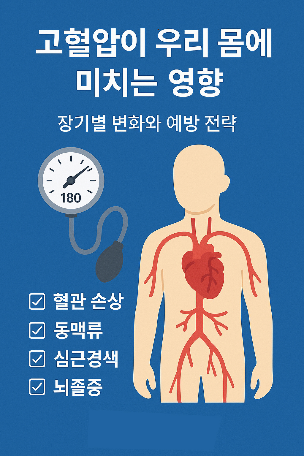 고혈압은 ‘조용한 살인자’라 불립니다. 증상이 거의 없지만, 장기적으로 몸의 거의 모든 기관을 손상시킬 수 있기 때문입니다. 정기적인 혈압 측정과 생활습관 개선만으로도 대부분의 합병증을 예방할 수 있습니다.