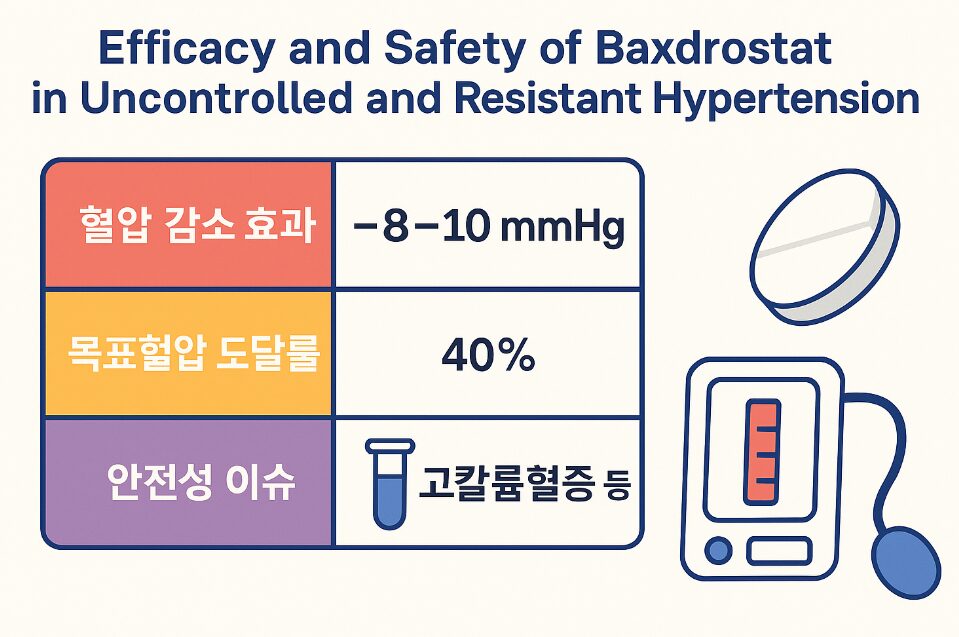 바크드로스타트는 조절되지 않는 고혈압 및 저항성 고혈압 환자에서 의미 있는 혈압 강하 효과를 보여준 새로운 약제 후보입니다. 다만, 고칼륨혈증과 신장 기능 저하의 위험이 있어 임상 적용 시 모니터링이 필수적입니다.