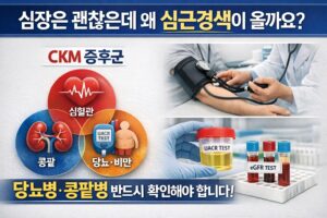 1. 심장병은 “심장만의 병”이 아닙니다 많은 분들이 심근경색이나 뇌졸중을 “갑자기 심장에 문제가 생긴 병”이라고 생각합니다. 하지만 실제 임상에서는 혈당, 콜레스테롤, 혈압, 복부비만, 그리고 콩팥 기능이 서서히 나빠지면서 수년간 축적된 결과로 나타나는 경우가 대부분입니다. 최근 미국심장협회(American Heart Association)는 심장질환, 콩팥질환, 당뇨병이 서로 밀접하게 연결되어 있다는 점을 강조하며 이를 심혈관-콩팥-대사 증후군(Cardiovascular-Kidney-Metabolic syndrome, CKM)이라고 설명했습니다. 핵심은 이것입니다. 심장이 … 심장은 괜찮은데 왜 심근경색이 올까요? – 심장 밖에서 시작되는 심혈관 위험: 당뇨병과 만성콩팥병을 반드시 확인해야 하는 이유 계속 읽기