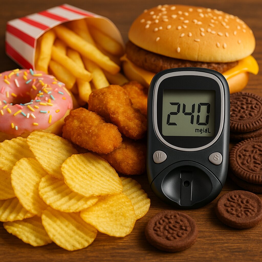 초가공식품 중심 식단은 결국 체중 증가, 인슐린 저항성 악화, 만성 염증을 통해 당뇨병 위험을 높이는 것으로 추정됩니다.
