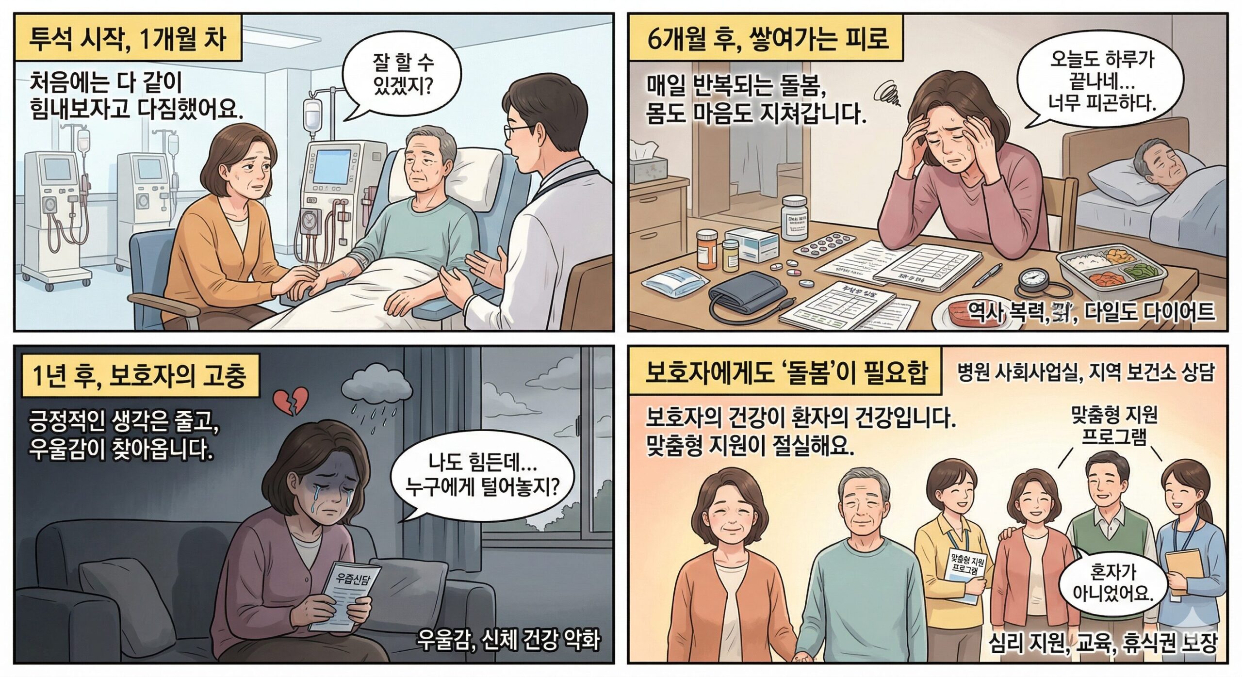 최근 장기 코호트 연구 결과에 따르면, 투석 시작 후 1년이 보호자의 심리적·신체적 상태를 결정짓는 가장 결정적인 시기임이 밝혀졌습니다.