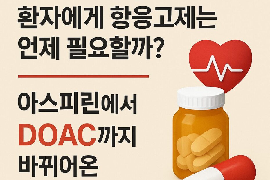 1. 관상동맥질환, 왜 ‘피떡’ 관리가 중요한가? 관상동맥질환은 심장에 피를 공급하는 관상동맥이 좁아지거나 막히는 병입니다.이 병의 가장 큰 위험은 혈전(피떡)입니다.혈전이 생기면 심장 혈류가 막혀 심근경색이 생기고,… 더 보기 »관상동맥질환 환자에게 항응고제는 언제 필요할까? — 아스피린에서 DOAC까지 바뀌어온 치료 원칙