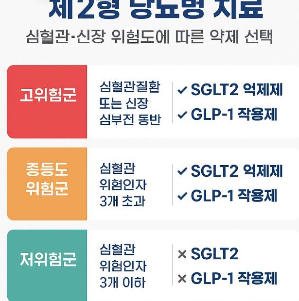 제2형 당뇨병(T2D)은 단순히 혈당 조절의 문제가 아닙니다. 심혈관질환(CVD)과 만성콩팥병(CKD)으로 이어질 수 있는 다기관 질환이기 때문에, 치료 전략 역시 단순 혈당 수치 이상을 넘어 환자의 개별… 더 보기 »제2형 당뇨병 치료, 이제는 심혈관·신장 위험도에 맞춘 맞춤형 접근이 필요합니다.