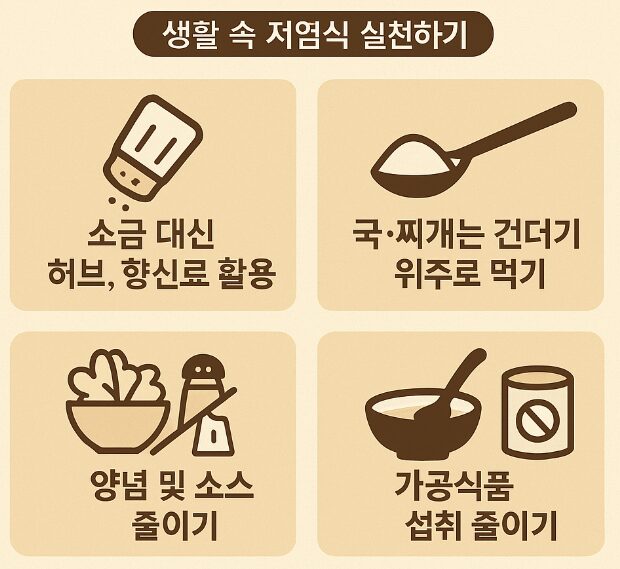 🍲 집에서 식사할 때 국·찌개는 건더기 위주로 → 국물은 절반 이하만 소금 대신 향신료 활용 → 후추, 마늘, 파, 레몬즙, 허브로 맛내기 간은 조리 마지막… 더 보기 »🥗 생활 속 싱겁게 먹기 실천 팁