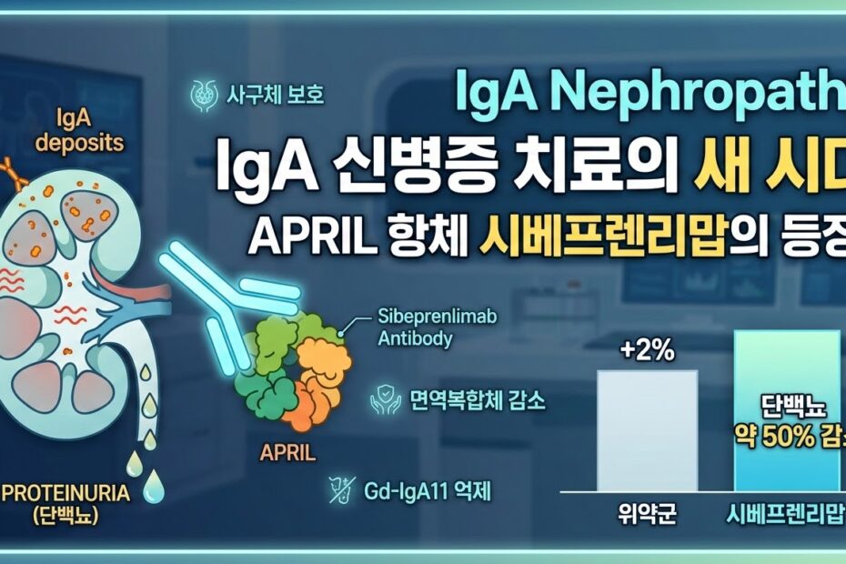 IgA 신병증 치료에 새로운 변화가 시작되었습니다 IgA 신병증(IgA nephropathy)은 전 세계적으로 가장 흔한 원발성 사구체 질환 중 하나입니다. 이 질환은 시간이 지나면서 지속적인 단백뇨 사구체여과율… 더 보기 »IgA 신병증 치료의 새로운 표적치료 – APRIL 항체 시베프렌리맙(sibeprenlimab)의 등장